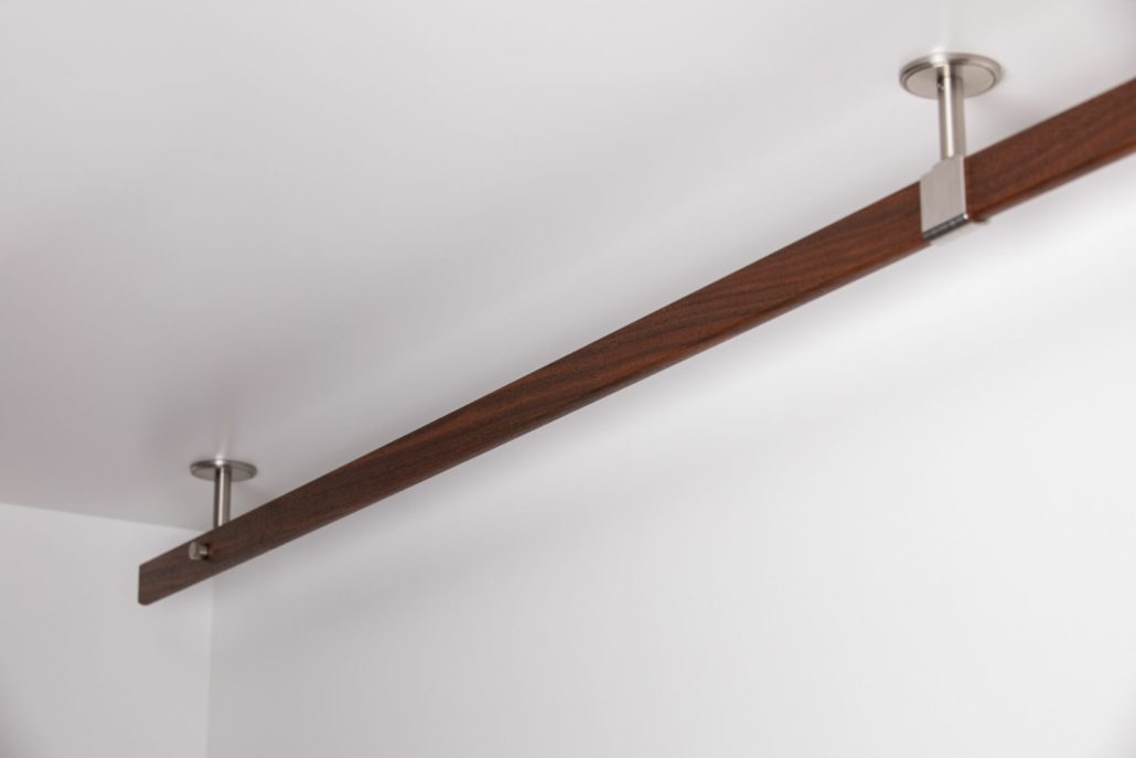 Maßgefertigte einläufige Vorhangstange aus Massivholz ca. 37 x 12 mm in Nussbaum (amerikanisch), oben und unten gerundet mit Radius 10 mm, Oberfläche geschliffen sowie naturgeölt.