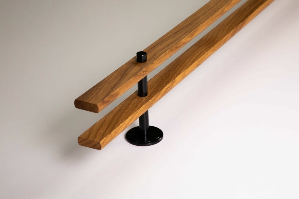 Maßgefertigte zweiläufige Vorhangstange aus Massivholz ca. 37 x 12 mm in Eiche, oben und unten gerundet mit Radius 10 mm, Oberfläche geschliffen sowie naturgeölt.
